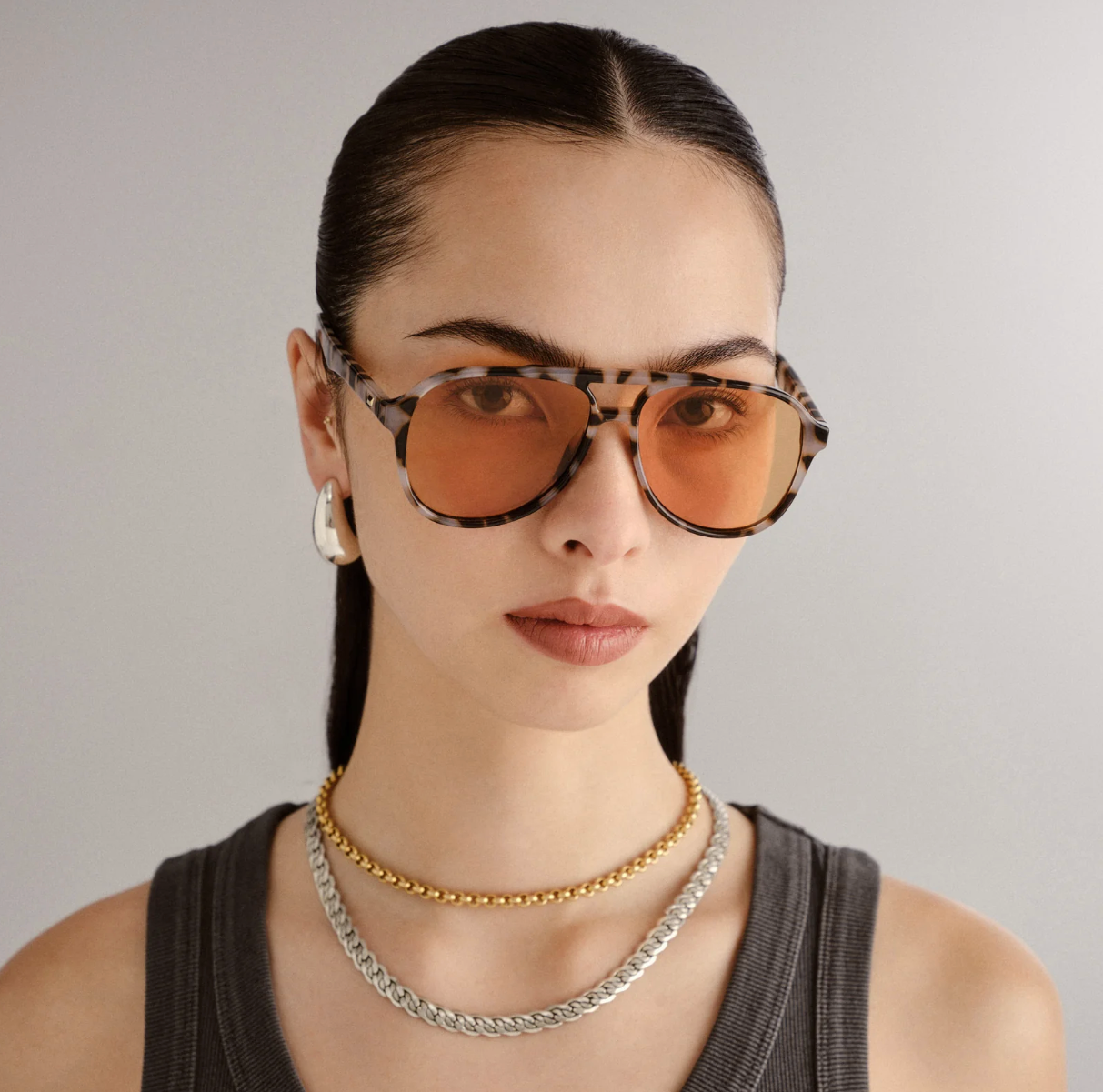 Exuding a carefree spirit and effortless esthetic, TRAGIC MAGIC is the must-have aviator sunglass for summer. This '70s inspired silhouette offers a slightly oversized fit with flattering unisex proportions and is detailed with our understated pyramid stud hardware on both temples.