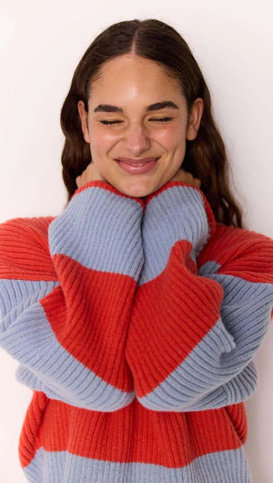 Make bold moves in the Freja Stripe Chunky Knit, your new go-to for colour and comfort. With statement red and blue block stripes, this soft rib knit is perfect for layering over denim or pairing with your go-to mini.