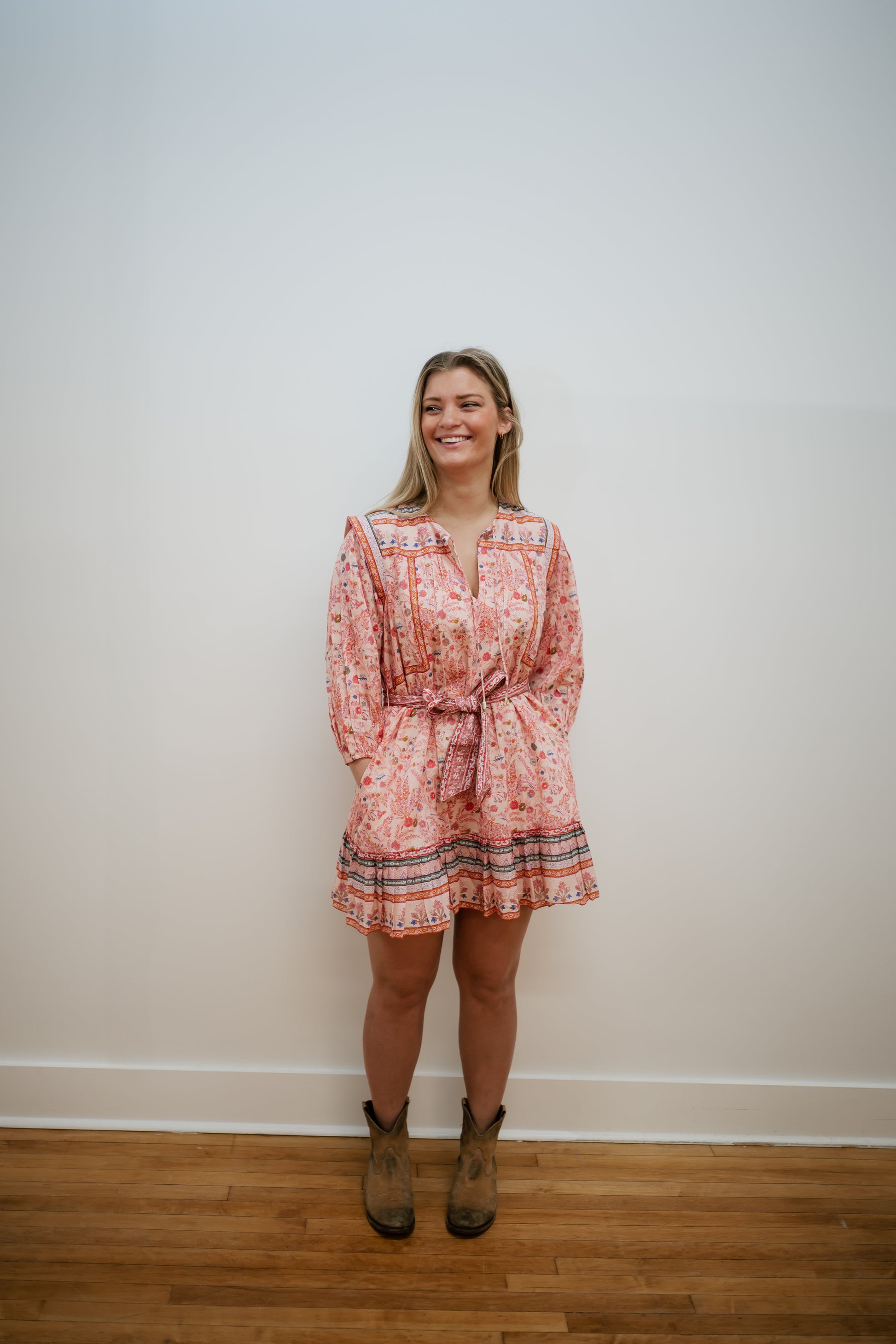 In 100% GOTS certified organic cotton mulmul, the Frieda Mini Dress is designed with a delicate floral print and a sweet border detail at the hem. This style features 3/4-length sleeves with gentle elastic for an easy, comfortable fit. A removable sash lets you cinch or loosen the shape, creating a soft flowy look perfect for all-day wear.