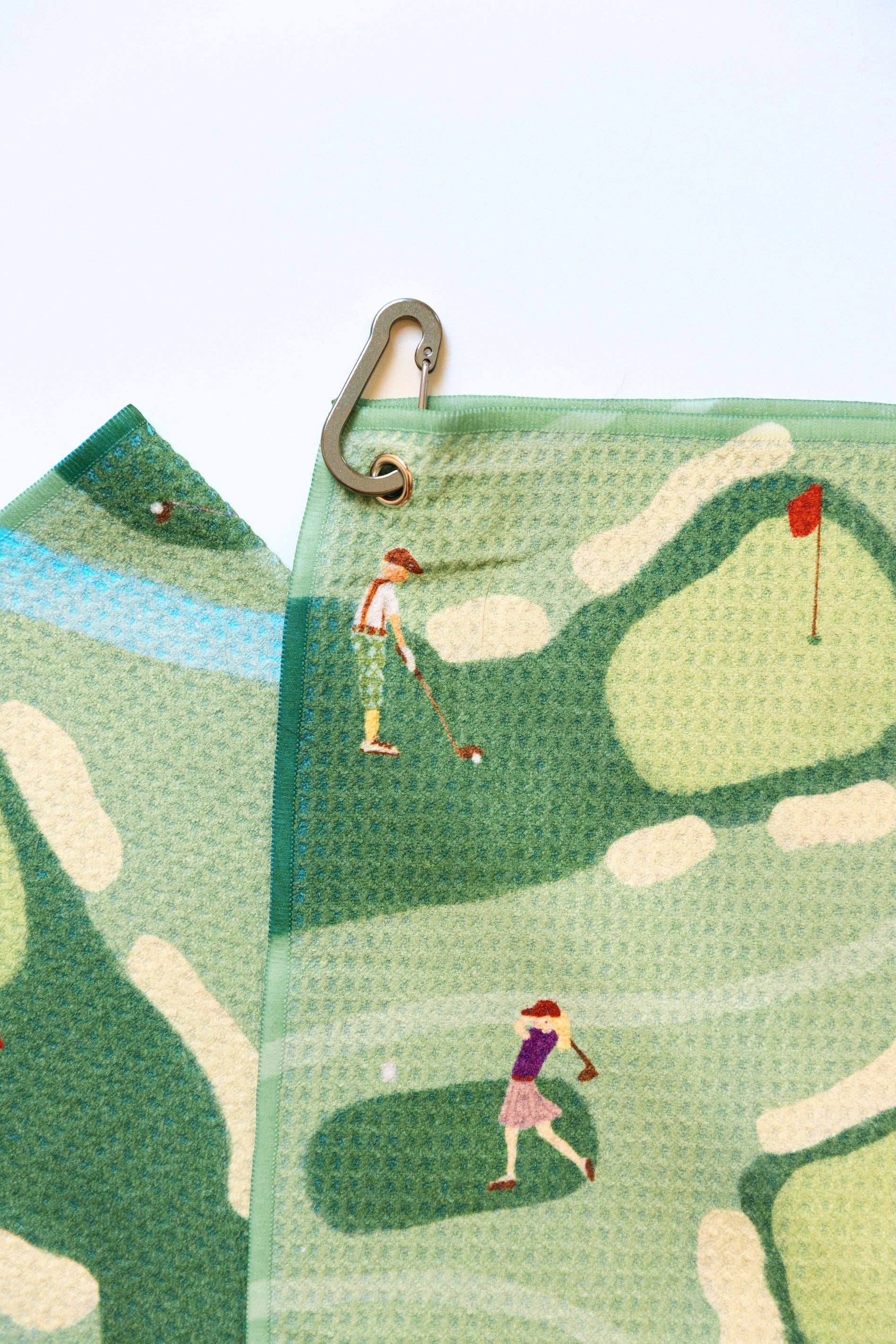 Designed with Claire Nilan, this scene-stealing piece captures the quirks and charm of a day on the course, rolling greens, tiny players, and all the action in between. Printed on ultra-absorbent waffle weave and easy to clip on, it’s a functional essential with a playful twist.