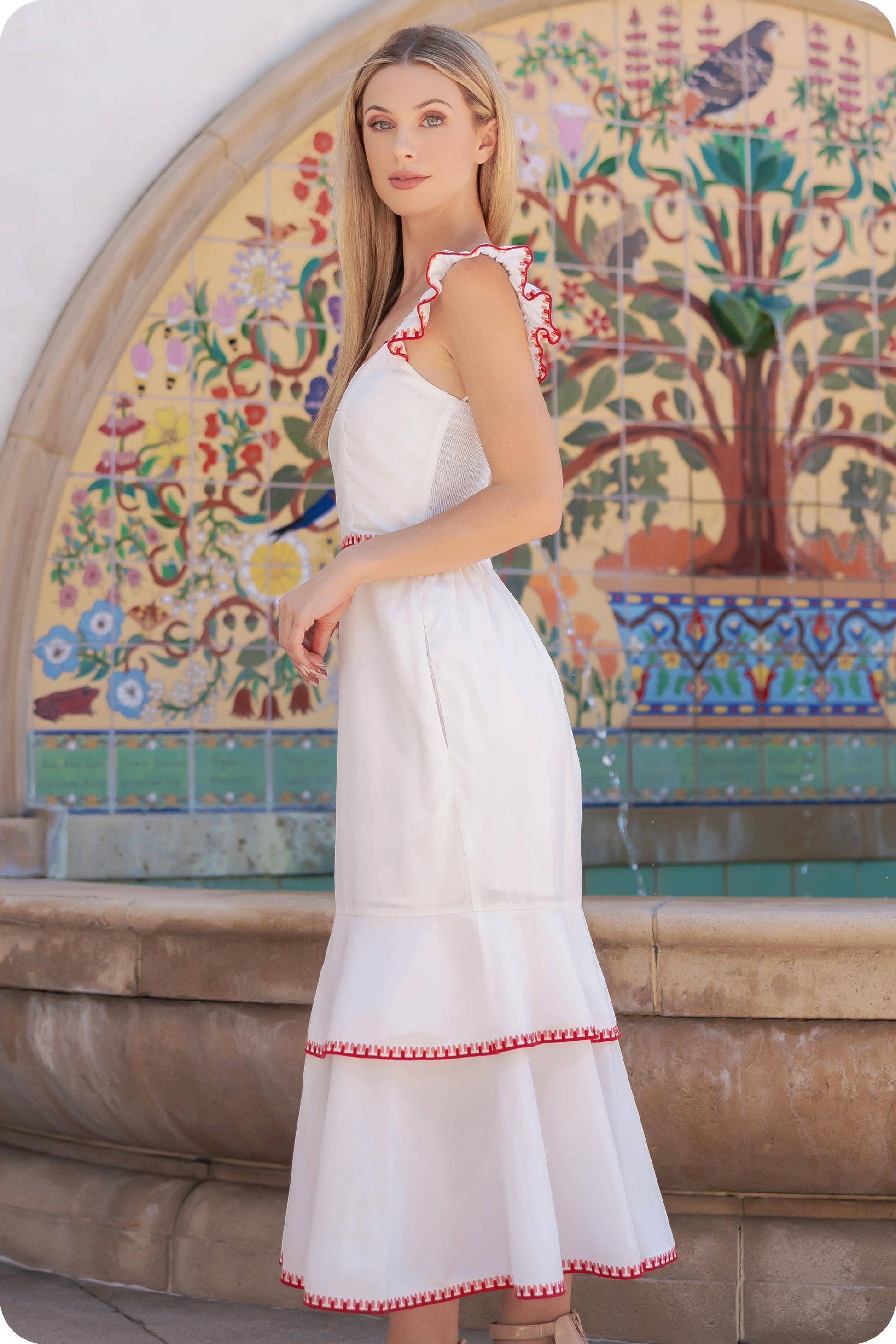 Layered embroidered midi dress in cotton blend woven fabric. This style features multi color embroidered detail throughout, side pockets, tiered mermaid midi skirt, sweetheart neckline, lining, stretch smocking at back bodice, and elasticated shoulder with ruffle detail.