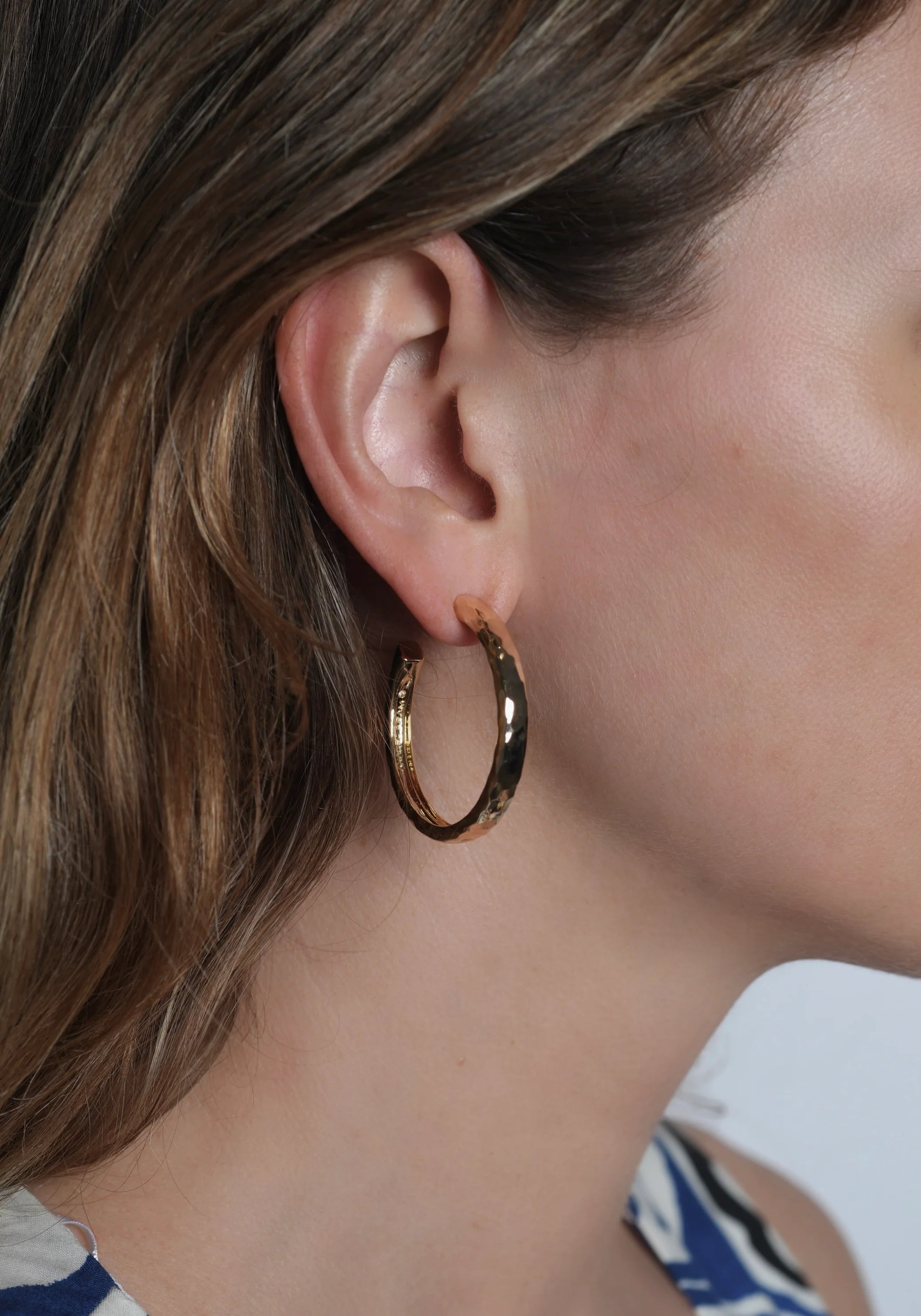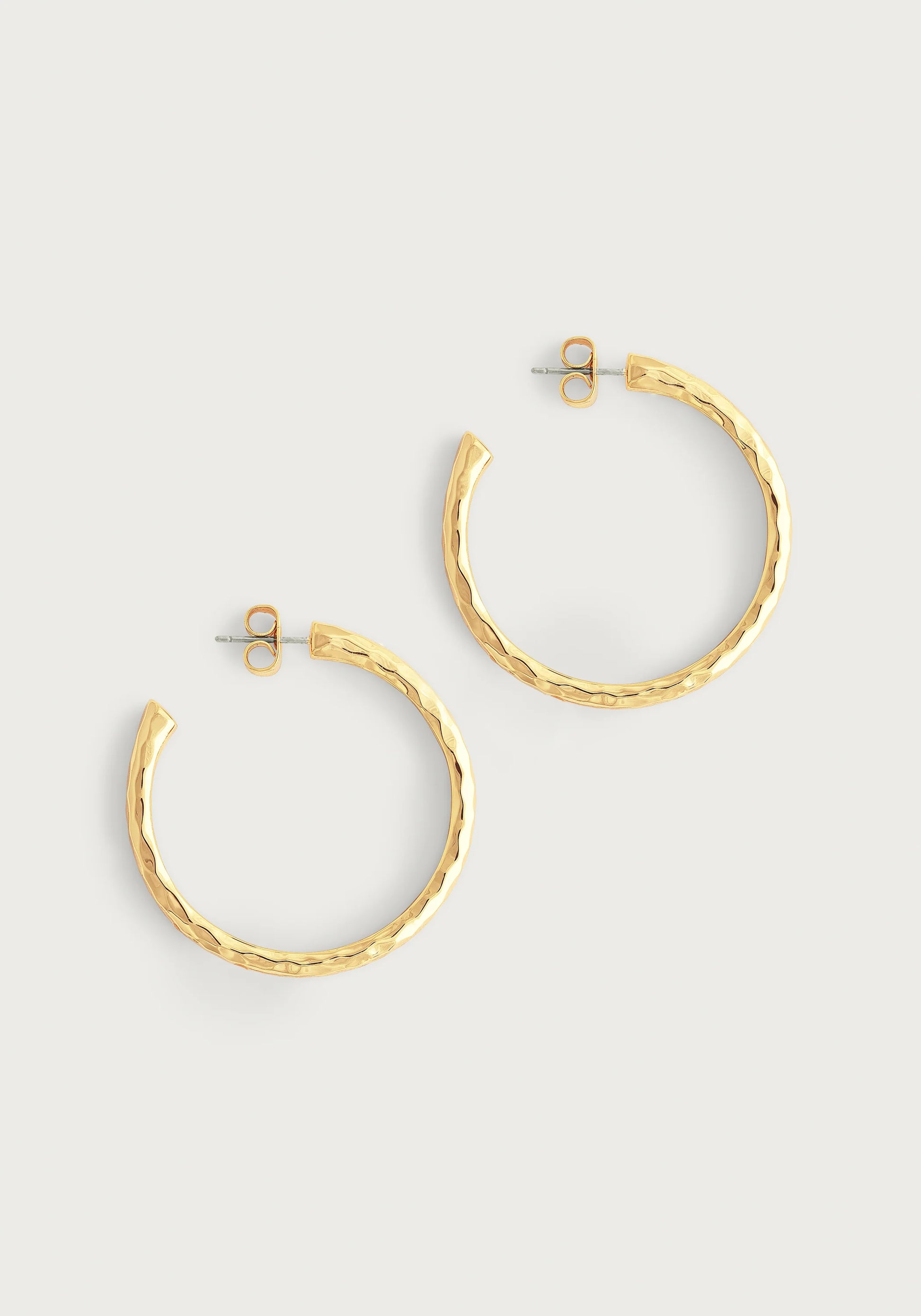 The Farrier Medium Hoop Earrings is a stunning piece crafted from 18k gold plated brass, designed to embody the rugged beauty and refined elegance of traditional farriery. Each earring features a distinctive hammered texture, echoing the artisanal marks left by a blacksmith's hammer, which gives the exterior a unique, tactile surface. These medium-sized hoops are versatile, perfect for making a statement in both everyday wear and special occasions. Secure closures ensure that these earrings are both practical and stylish, making them a beautiful blend of tradition and modernity.