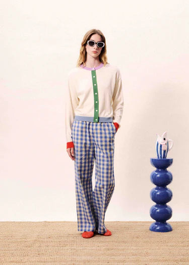 • Colorblock details: purple collar, red cuffs, blue-grey hem
