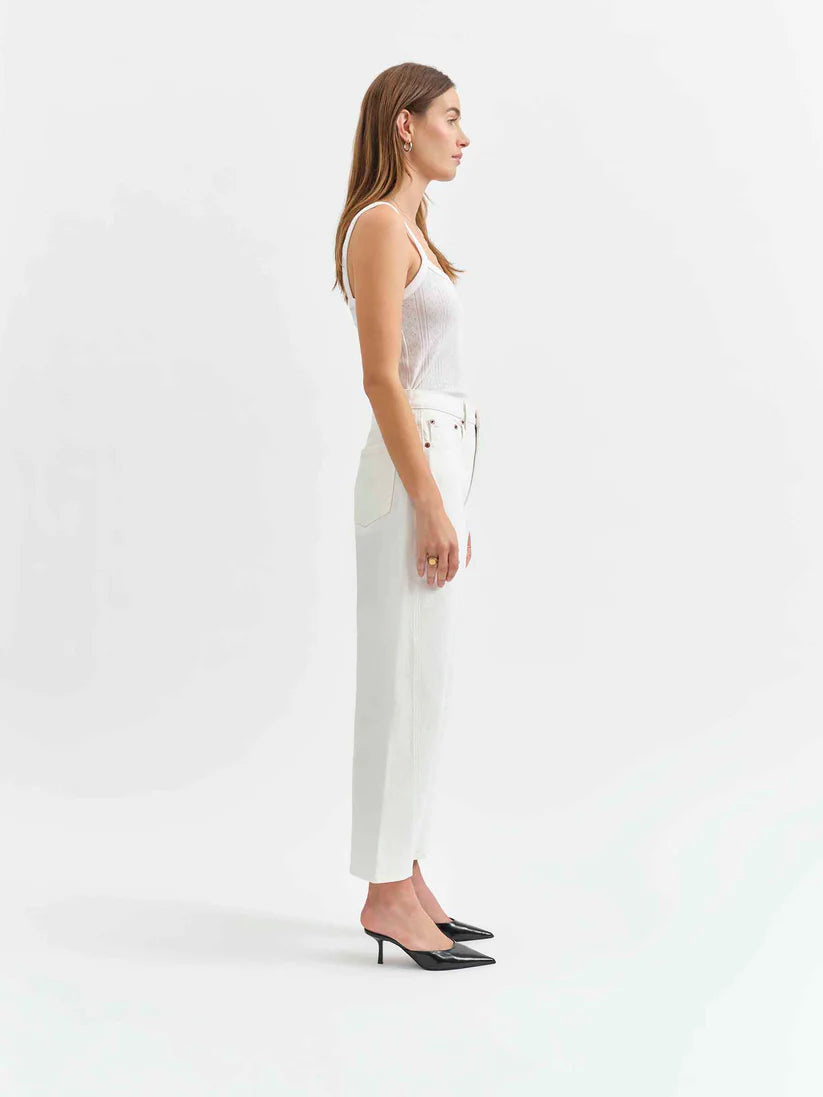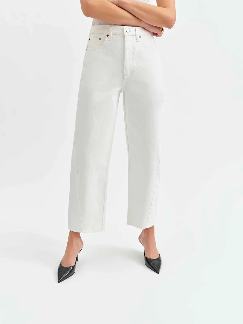 The Westward in Swan is a high rise jean with a trending barrel leg silhouette. Featuring a cinched waist, bowed leg, and slightly tapered ankle against a crisp white wash, this jean is as versatile as it is flattering.