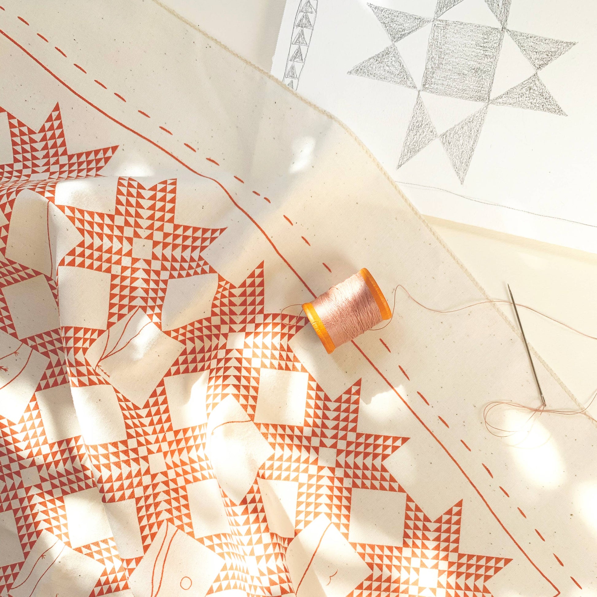 The Quilt Bandana is inspired by traditional quilt squares and meandering landscapes, the Quilt Bandana offers glimpses through portal-like windows - a nod to memory, connection, and craft passed down through generations.