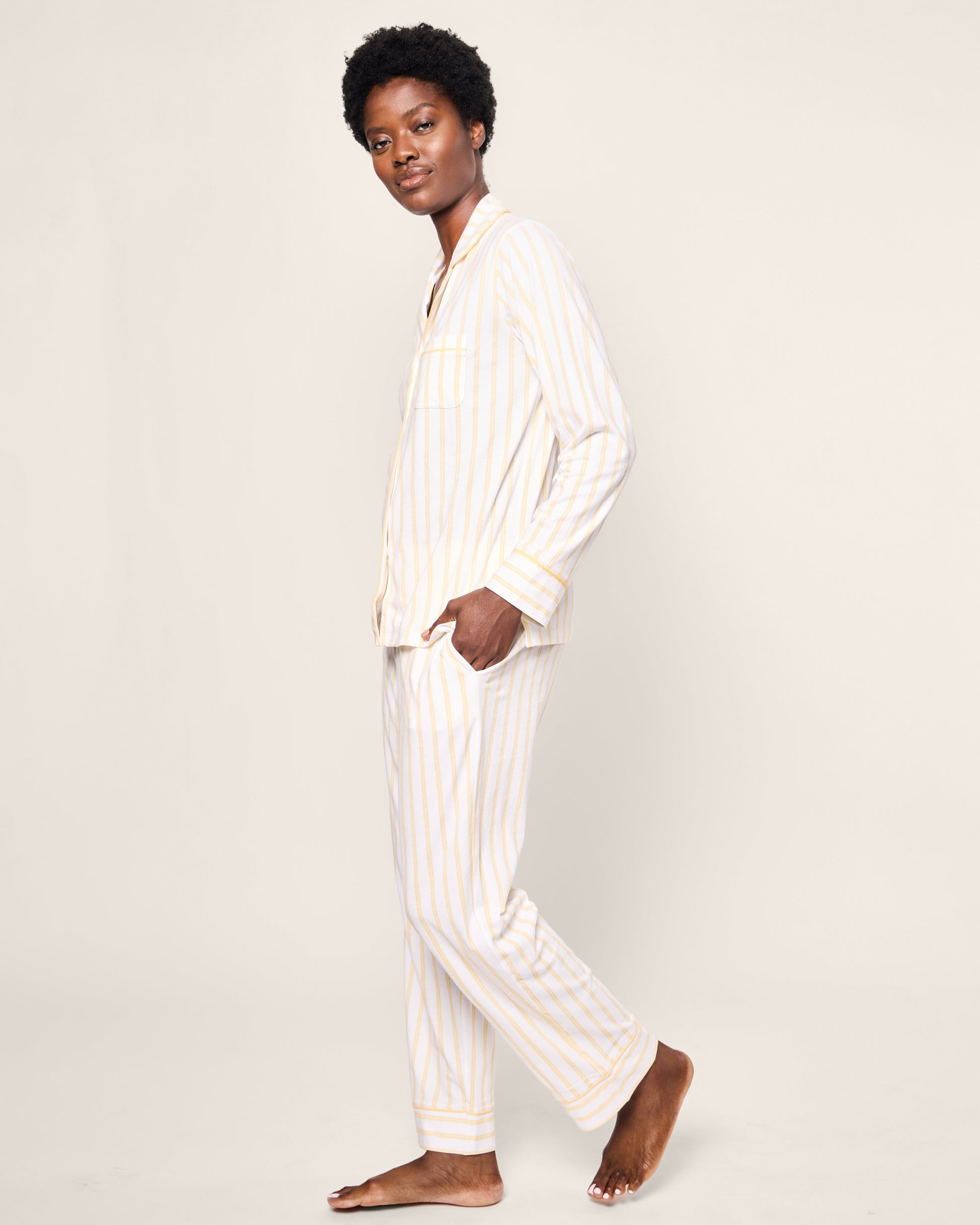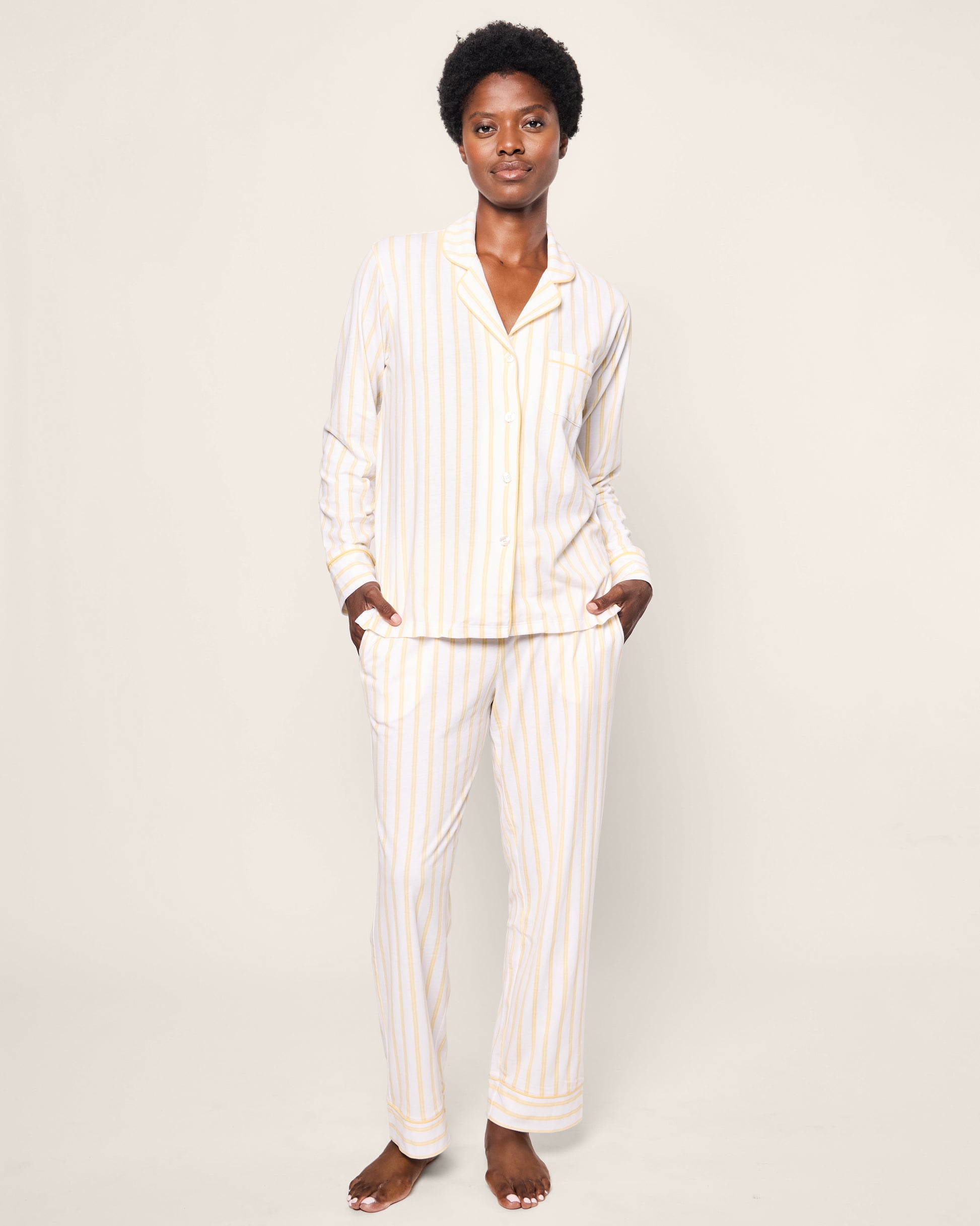 This classic pajama set is accented with piping and finished with buttons. Our Pima Collection is sewn from this exquisite fabric: luxurious, supple jersey knit pajamas that drape beautifully and continue to soften with each washing. Buttery and smooth, yet breathable, this collection is yarn-dyed to prevent fading and is destined to become a fixture of your soothing bedtime ritual. You will be tucked in luxury and off to dreamland.